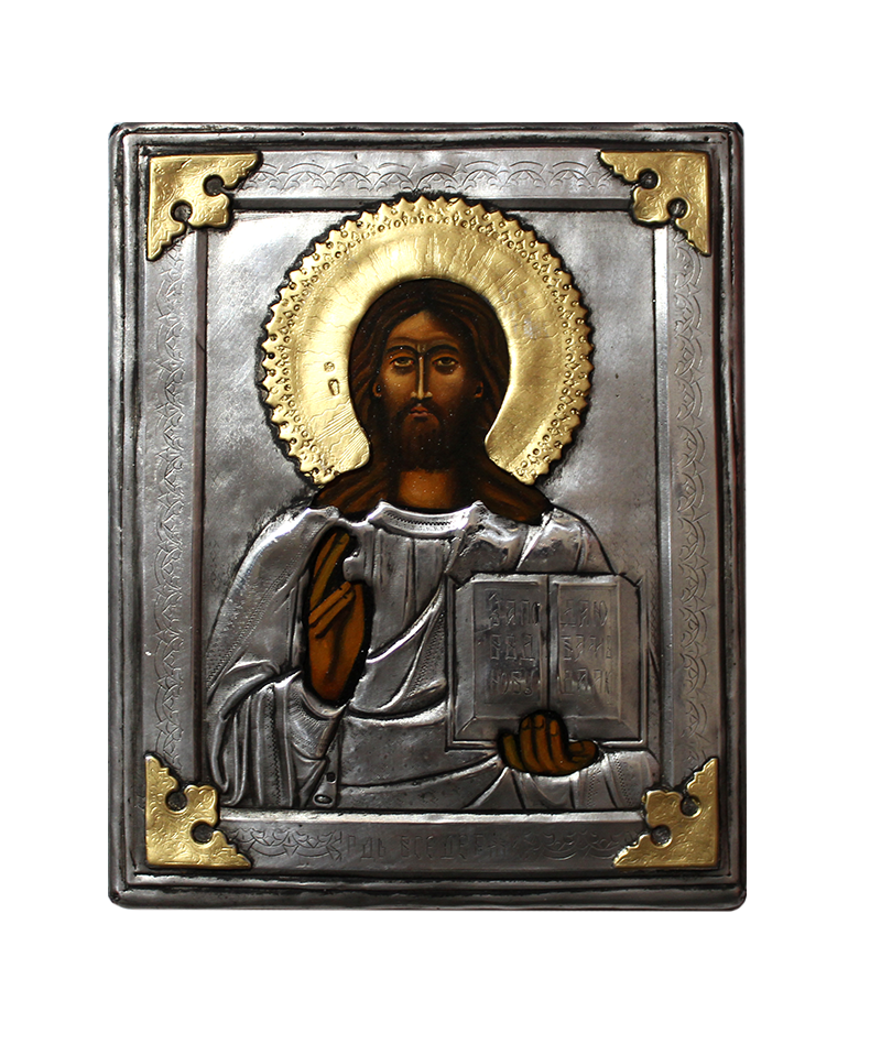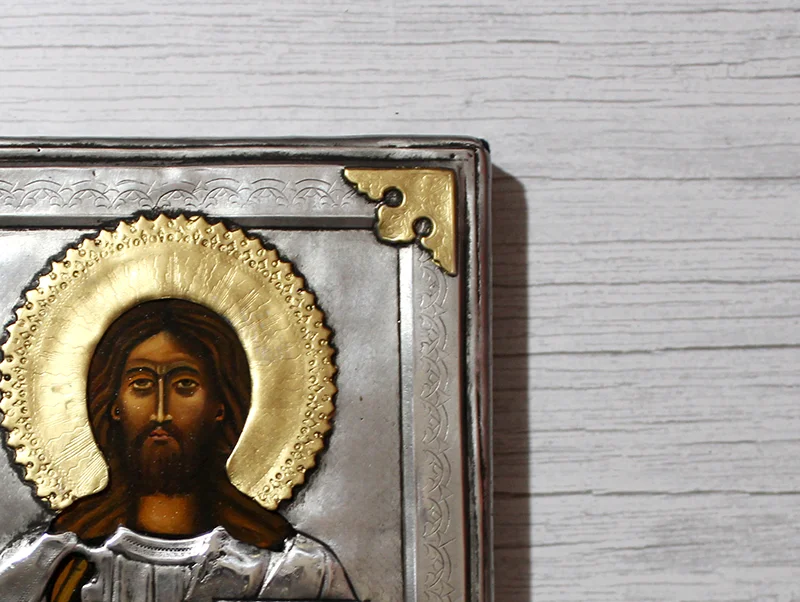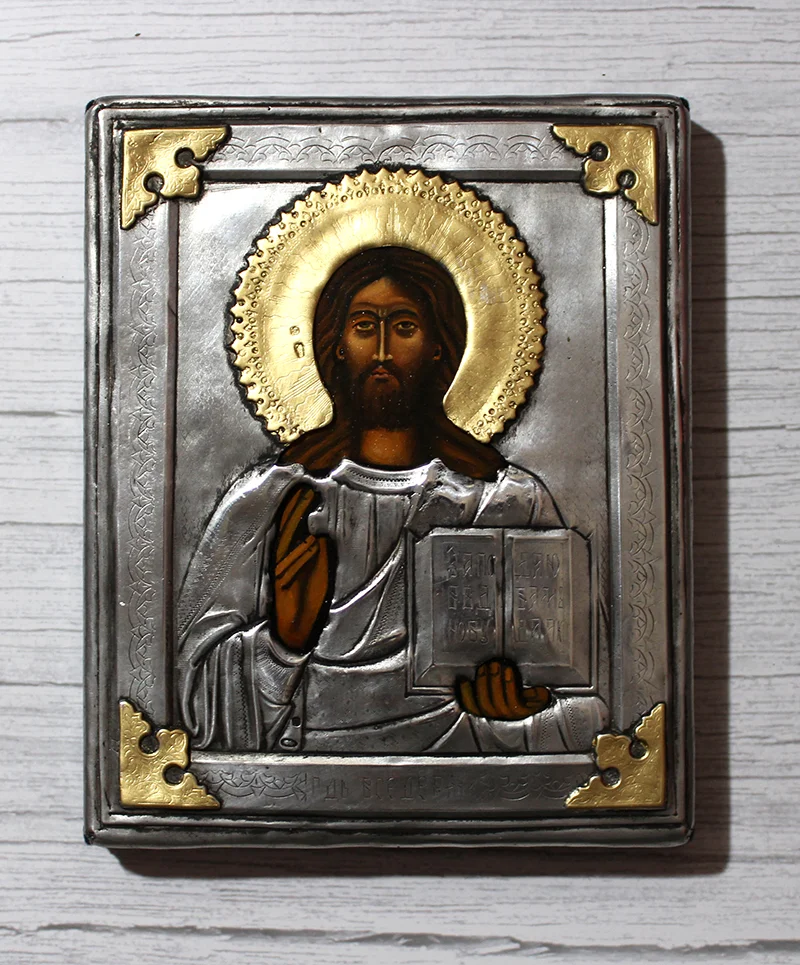 Front wykonano z metalu z dekoracyjnymi zdobieniami i złoconymi narożnikami. Postać Chrystusa oraz detale aureoli malowane są ręcznie farbą olejną, z najwyższą precyzją i dbałością o szczegóły. Tył ikony to solidna deska, obita materiałem typu welur.